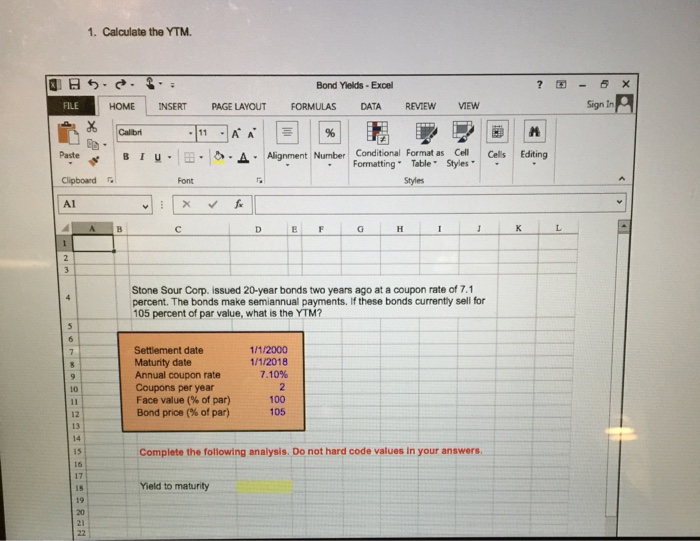 Bonds Calculate Coupon Rate - YouTube how to calculate coupon rate on a bondexamples using excel and financial calculator Using RATE function in Excel to calculate interest rate Monthly payments: nper = years * 12. Quarterly payments: nper = years * 4. To get an annual interest rate, multiply a periodic interest rate returned by the function by the number of periods per year. Monthly payments: annual interest rate = RATE () * 12. Quarterly payments: annual interest rate = RATE () * 4. Coupon Rate Formula | Calculator (Excel Template) - EDUCBA Coupon Rate = (Annual Coupon (or Interest) Payment / Face Value of Bond) * 100. Below are the steps to calculate the Coupon Rate of a bond: Step 1: In the first step, the amount required to be raised through bonds is decided by the company, then based on the target investors (i.e. retail or institutional or both) and other parameters face value ... How to calculate YTM in Excel | Basic Excel Tutorial Now let us create the YTM using these values. 1. Launch the Microsoft Excel program on your computer. 2. Write the following words from cells A2 -A5. Future Value, Annual Coupon rate, Years to maturity, and Bond Price. 3. Format the column width in the excel sheet so that it is wide enough to accommodate all characters.