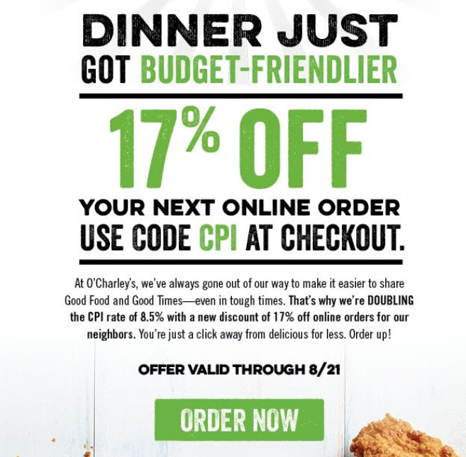 20% off O'Charley's Coupons & Specials (Sept. 2022) - Offers.com Free $25 Restaurant.com Card with Friend Referral, Verified Used 54 Times Today, Get Offer, 20%, Off, Monday Special 20% off Classic Combos, Verified Used 15 Times Today, Get Offer, SALE, Sitewide Offer, FREE Slice of pie with the purchase of an adult entrée, Verified Used 22 Times Today, Get Offer, + Show Details & Exclusions, SALE,